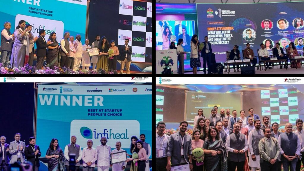In the Valedictory function of the Bengaluru Tech Summit, Infiheal was also awarded as the winner for Best AT Startup – People’s Choice by AssisTech Foundation. The award was presented by Shri Priyank Kharge, Minister for Electronics, IT & Bt, Rural Development, and Panchayat Raj, and Sharath Kumar Bache Gowda, Chairman, KEONICS; Dr. Ekroop Caur, IAS, Secretary to Government, Department of Electronics, IT, Bt, and S&T, Government of Karnataka; Dr. Sharanprakash Patil, Hon’ble Minister for Medical Education & Skill Development, Entrepreneurship & Livelihood; Sri Eshwar Khandre, Hon’ble Minister for Forest, Ecology, and Environment; and Sri Radha Krishna, MP, Gulbarga, GoK.
