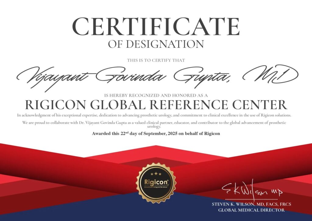 The certification, awarded on September 22, 2025, serves as the highest seal of approval from Rigicon, a world leader in innovative prosthetic urology and andrology solutions. It recognizes Dr. Gupta’s mastery in surgical precision, his dedication to clinical excellence, and his pivotal role in advancing patient outcomes in the field of penile implants and artificial urinary sphincters.
