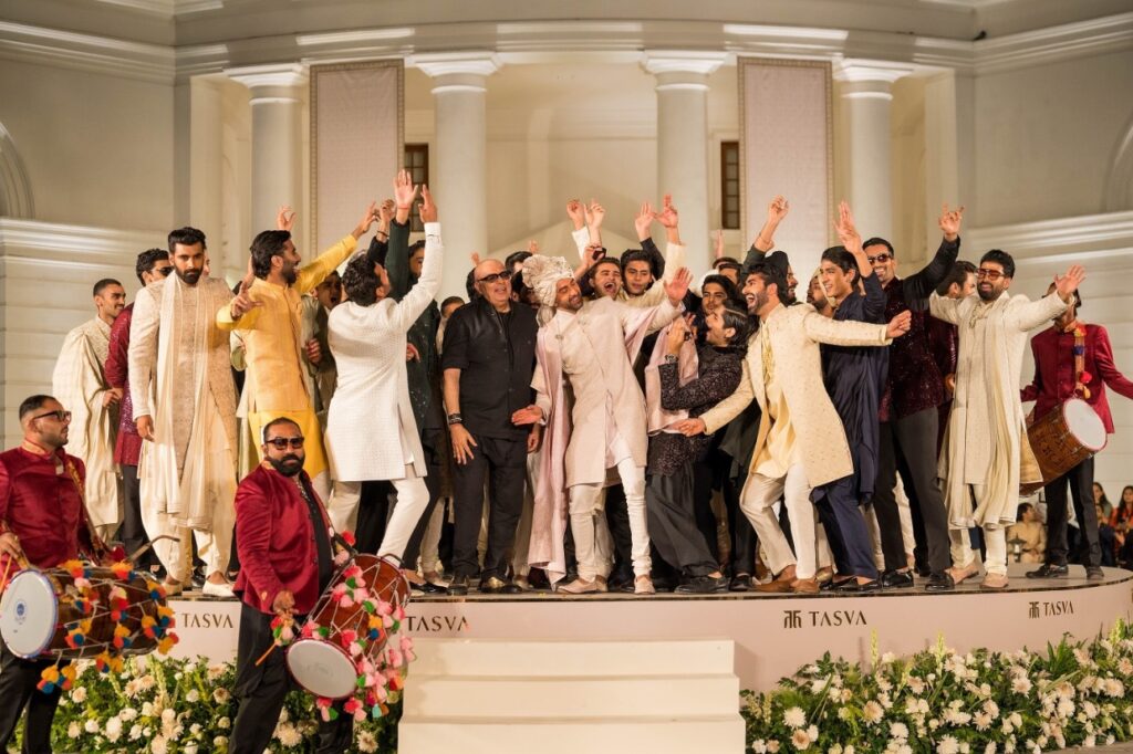 The ‘BAARAAT’ by Tasva, was inspired by the lively and vibrant Indian wedding procession, reimagined as a fashion showcase that spotlighted the groom. The baaraat, traditionally symbolizing the groom’s joyous arrival, was presented in this unconventional and visually stunning fashion show.